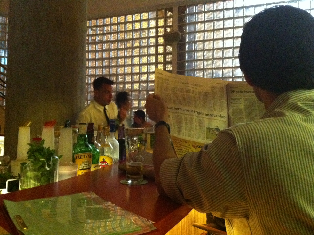 Devo confessar que eu fiquei de queixo caído quando entrei lá pela primeira vez. No balcão do térreo pessoas estilosas, rindo alto e segurando belos drinks dominavam o ambiente. Enquanto um lia o jornal, outro no canto desenhava freneticamente ao som do jazz que tocava ao fundo. O rapaz de olhos azuis ao meu lado observava o movimento de cada um naquele grande balcão quadrado, e de canto de olho lia minhas anotações. Pedi ao garçom o “Ed. Anchieta”, e não estava me referindo ao prédio na esquina da Consolação com a Av. Paulista onde o bar está instalado, mas sim ao drink de frutas amarelas com manjericão do cardápio. Fiquei um bom tempo olhando a estante na parede que continha alguns livros, objetos de decoração e dois aquários, e só agora lendo outras matérias fui descobrir que os peixinhos dourados do Riviera foram batizados de Zé e Juvenal, nome dos lendários garçons do antigo bar.