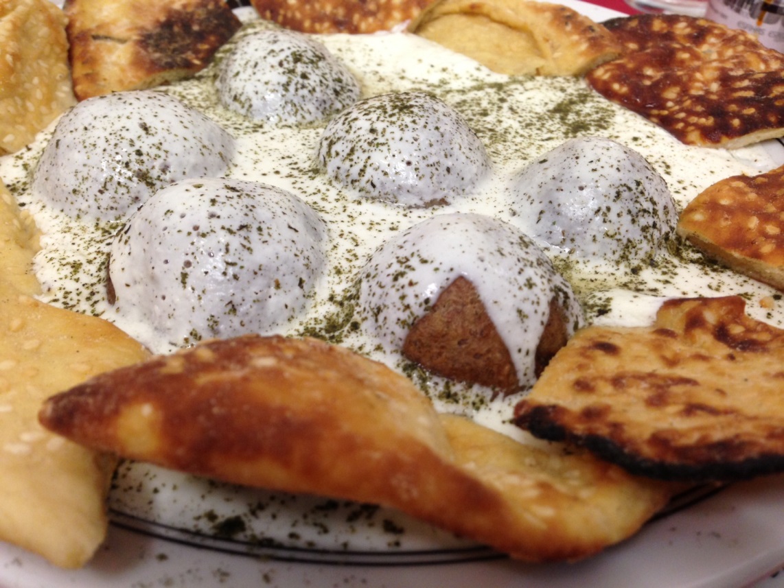 Quando sentei o garçom me perguntou, “vai beber o que?”, procurei o nome mais exótico que encontrei na parte de bebidas do cardápio e respondi, “airan”. Descobri que essa é uma bebida típica feita de coalhada, tradicionalmente se bebe com sal ou açúcar, mas aí eu vi que tinha uma opção de beber batida com mel. Foi essa mesma! Uma delícia, surpreendentemente bom. Uma parada “meio iogurte, meio milk-shake”. Mas as maravilhas de coalhada só estavam começando, pois também descobri o Madzunov Kiofté. Calma, não é palavrão. É o seguinte, eles fazem quibes no formato de bolinhas, recheados com carne e snobar, aí eles encobrem tudo isso com coalhada e especiarias armênias e colocam no “forno da bruxa malvada”, resultando em um quibe assado dentro da coalhada – engasguei com a minha própria saliva escrevendo isso, juro.