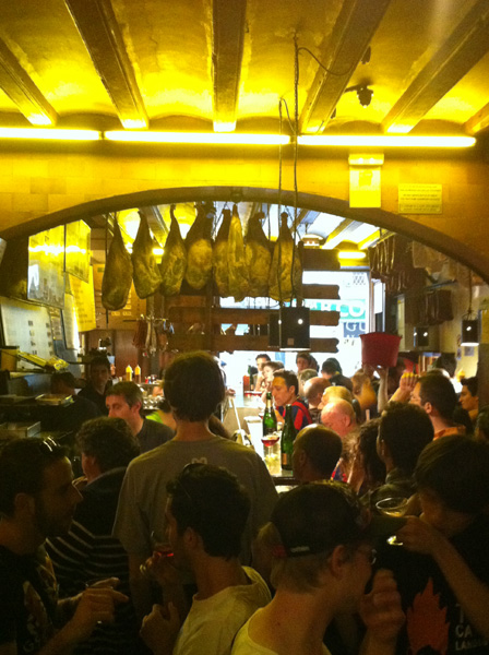 mais de uma amiga tinha sugerido, pensando que era sugestão “da boa”. E era mesmo. O Can Paixano, ou simplesmente Champanheria, é um lugar que precisa mesmo da indicação de alguém para se conhecer, ou de muita sorte para encontra-lo numa viagem de poucos dias. O bar fica próximo ao metrô Barceloneta, perto da praia, porém numa rua chamada Carrer de la Reina Cristina que é um pouquinho mais distante e sem movimento. Se por acaso estiver passando na frente do bar, você não vai nota-lo por placas indicativas, nem pelo nome na porta, mas sim pelo intenso movimento lá dentro a qualquer hora do dia. Ao entrar, vi aquilo que se espera de um bar espanhol que é conhecido como Champanheria: havia muitos jamóns pendurados no teto e infinitas garrafas de vidro expostas. E ao fundo, uma lojinha onde se pode comprar vinhos, embutidos e conservas.