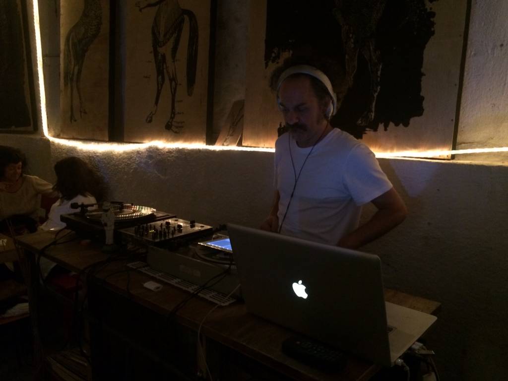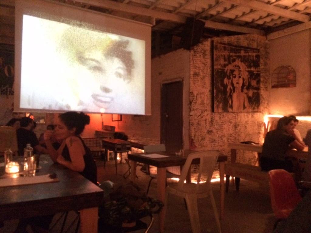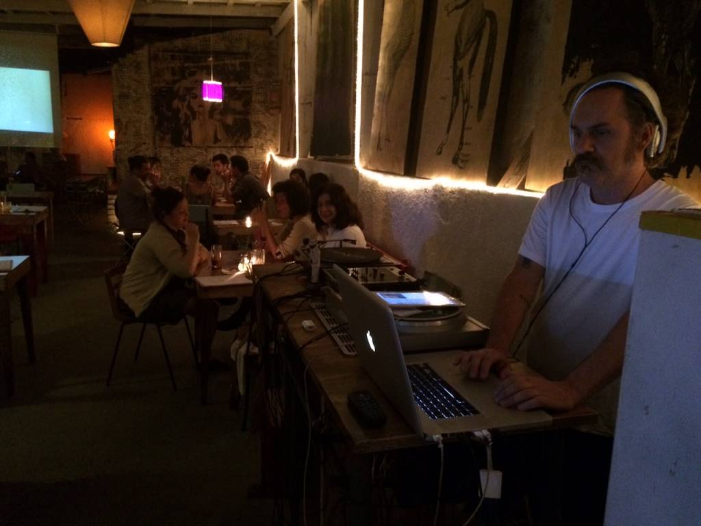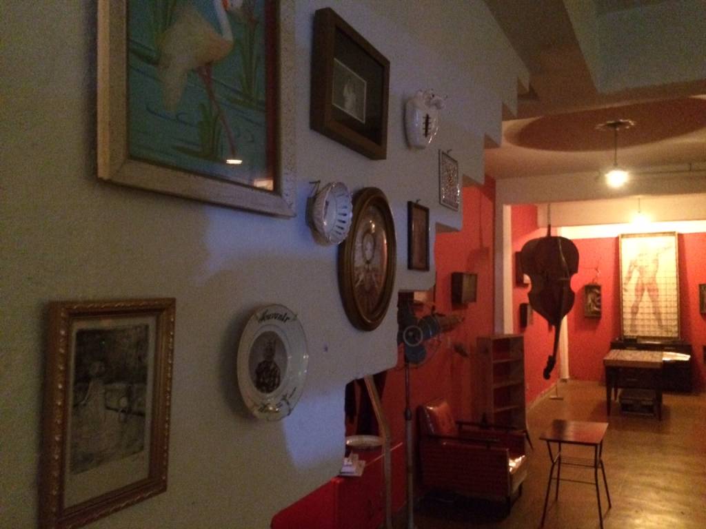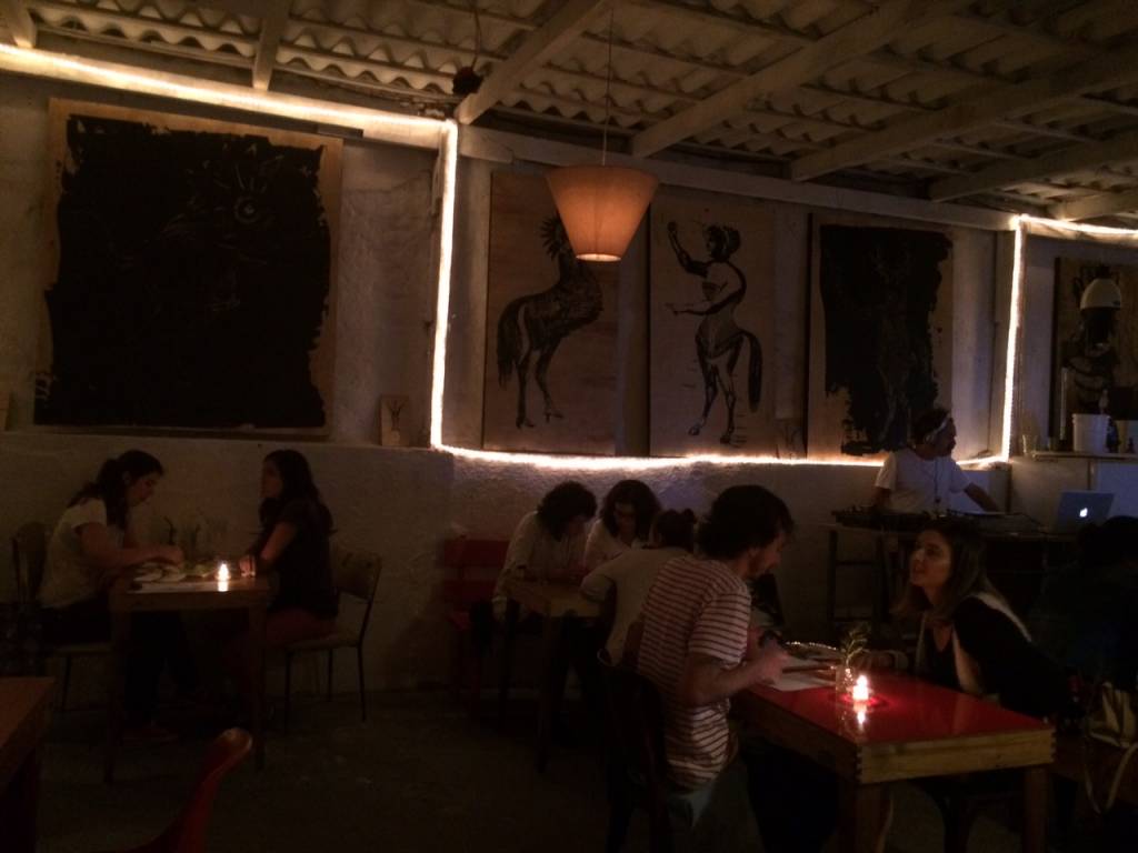 Foi em um descer de escadas que as luzes foram se abaixando e o clima ficou mais intimista. O espaço que antes era voltado exclusivamente para artes, ganhou uma atmosfera de bar. Elementos artísticos, vintages, luminosos, DJ e telão com filmes heterodoxos.