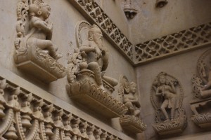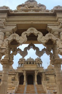 Primeiro fomos visitar uma exposição fixa de lá, “Entendendo o hinduísmo”. Esta, para explicar a origem da religião, seus valores, sua história, sua expansão e sua importância para o mundo. Mais uma vez naquele dia me emocionava com o que meus olhos viam. Além do texto sagrado que já comentei, me encantei por muitos outros textos, bem como pelas histórias hinduístas. Quando finalmente entramos no templo, prestigiamos um lugar cor de branco “puro” – este feito de mármore italiano e calcário bulgário (Mais uma vez não pude tirar fotos de dentro, mas clicando aqui você pode ver algumas fotos do seu interior). Me emocionei mais um pouco com a doação e sinceridade dos fiéis, que incluía crianças pequenas e velhos. Como se já não tivesse visto bastante, o simpático rapaz que ficava na recepção nos levou na “Haveli Prayer Hall”, uma imensa sala feita para reza e celebrações. É lá, por exemplo, que acontece o “Diwali festival”, o ano novo hindu. Como estava tudo apagado, deu pra ver só uma das quatro salas que formam o grande hall, o que já era um espaço imenso. Ele disse que lá cabem mais de 2.000 pessoas rezando sentadas. Façam as contas!