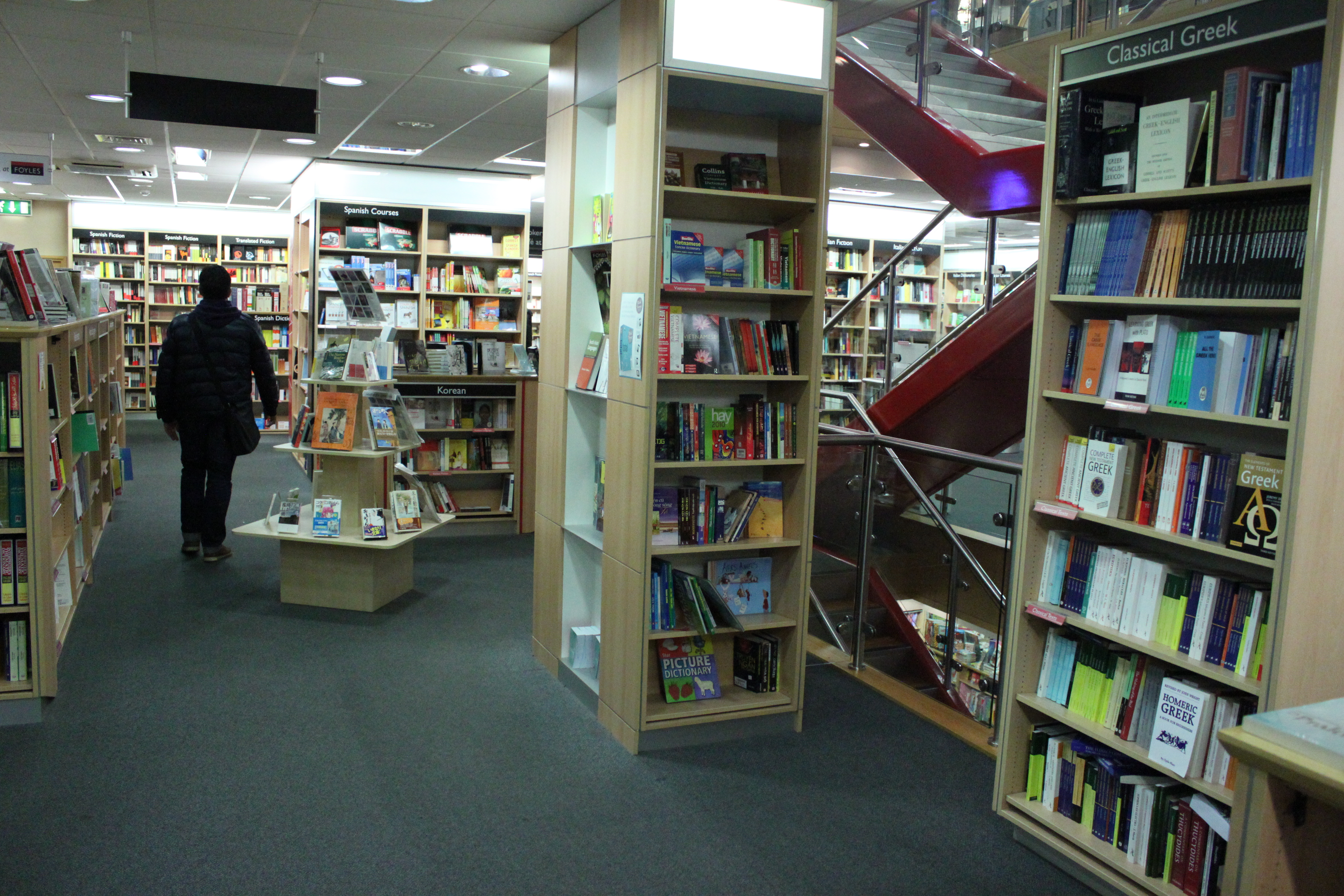Concordei plenamente. Realmente, a Foyles é um sonho. Trata-se da maior livraria do mundo, bem no centro de Londres. O lugar com mais títulos de livros que existe. O que irei relatar agora aconteceu ontem, uma comum 3ª feira chuvosa. Ao chegar circulei pelo primeiro andar e vi, como em toda grande livraria, inúmeros livros, mas a presença de livros em variadas línguas, como japonês e chinês, já apontava a gama de pessoas que a Foyles recebe.