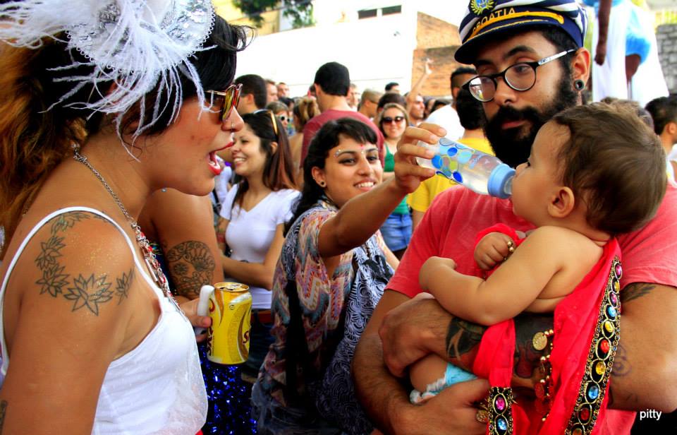 Ah sim, estávamos com um baby a bordo, então ficamos mais distantes da muvuca. E esse foi outro ponto alto da experiência: muitas, mas muitas crianças de todos os tamanhos, felizes e fantasiadas, curtindo o bloquinho na companhia de seus familiares. Aliás, a trupe da cerveja e da pegação (suave, nada de puxões de cabelo) coexistia harmonicamente com essa txurminha. E, nos prédios e terraços de casas, moradores dançavam, acenavam, brincavam e riam junto com a gente. Cena ótima: um mocinho já ia fazendo xixi na rua quando, do além, surge um jato de água bem e apenas em sua cabeça. “Tá chovendo só em mim, gente”? Não, amigo, é que a moradora daquela casa ali acabou de dar uma mangueirada em você, mas tudo na paz, e todo mundo morreu de rir!
