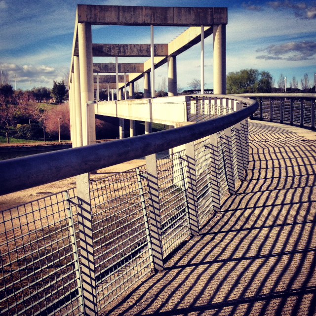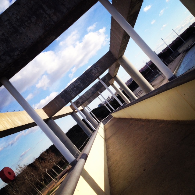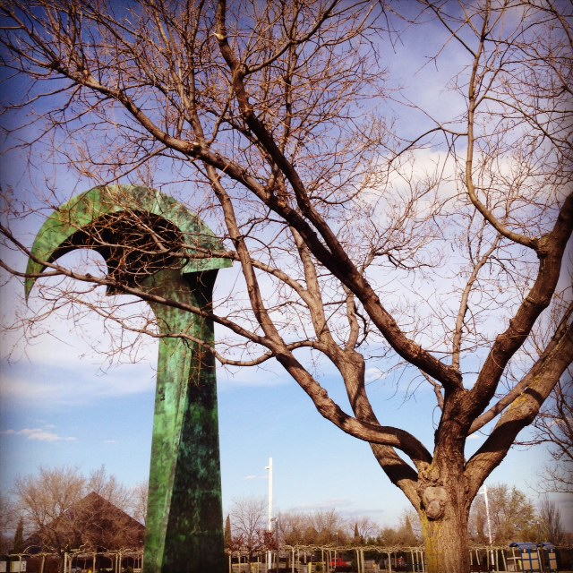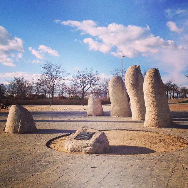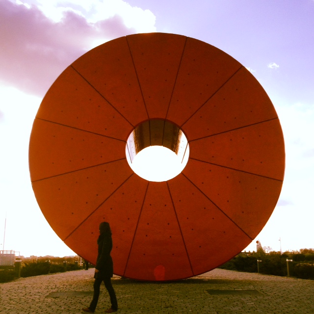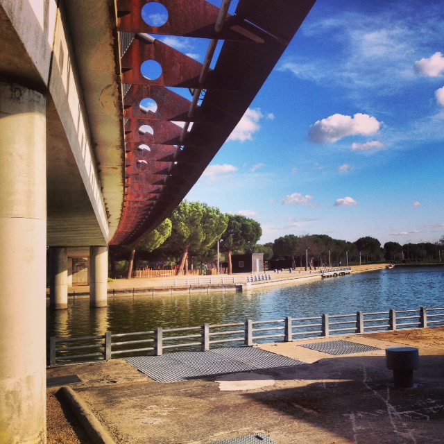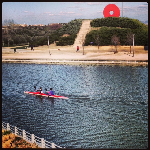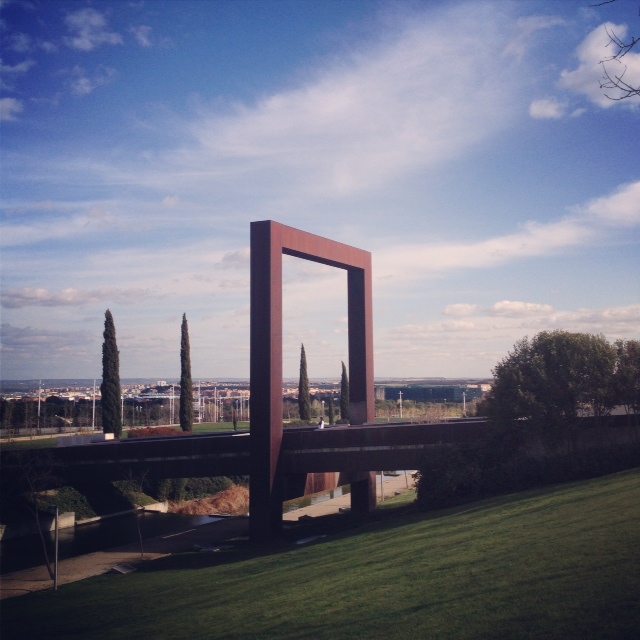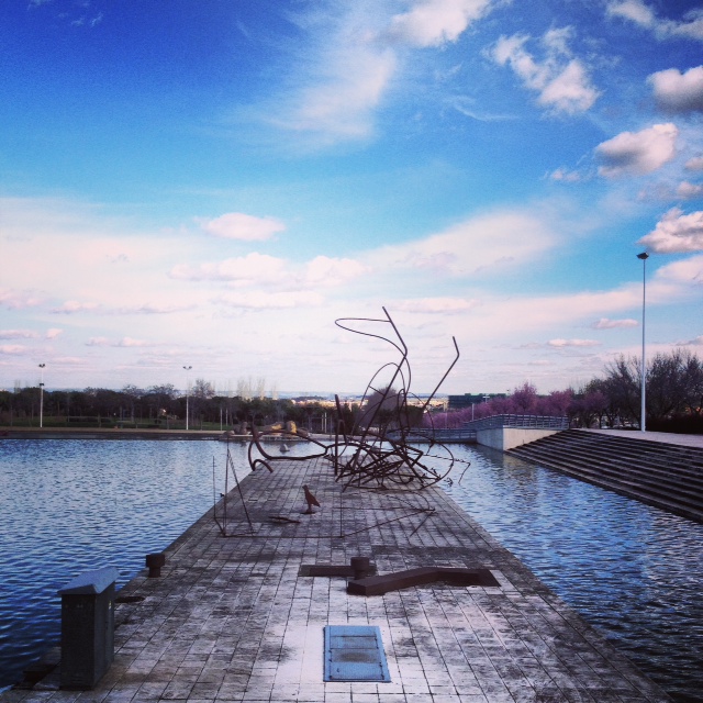 O que posso dizer de lá? Que sim, é o parque mais estranho que já fui, não sei se o mais lindo, mas com certeza um dos mais lindos. O parque Juan Carlos I foi um projeto para recuperar uma área totalmente degradada de Madrid, e parece que deu certo. Hoje, pelo o que eu vi, essa região conhecida como Barajas é super bonita e organizada, para mim pareceu até uma “maquete” em tamanho real – com suas fontes, ruas impecavelmente limpas, jardins bem cuidados e uns pequenos edifícios comerciais bonitinhos pelos arredores. E claro, o parque. Um lugar imenso, plano, verde, que está no meio do quase-nada. Que quando você entra te parece um parque normal, mas depois de cinco minutos de caminhada você começa a ver umas esculturas enormes, um lugar que tem como união a arquitetura, o paisagismo e a escultura. Um lugar muito vazio, que merecia tantas (ou até mais) visitas que o Retiro, mas que fica ainda mais lindo assim. O parque é tão bem planejado que até os banquinhos ficam devidamente posicionados para apreciar “tal ou tal” paisagem. Muitas paisagens. Muitas pontes e um rio que tinha algumas pessoas praticando caiaque, o que é interessante, já que um dia foi mega poluído e hoje é o lugar ideal para respirar bem e profundamente.