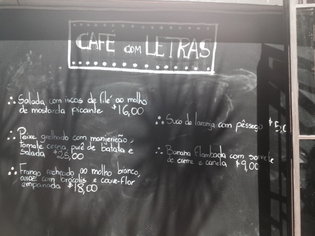 Lá funciona assim: não gosta de café? Tem almoço. Não quer almoçar? Peça uma bela cerveja (eles tem um cardápio muito bacana com várias opções). Não quer cerveja? Vá na livraria e compre um livro! Não quer ler? Então veja a exposição. E sim, ainda há mais, para quem não quer nada disso: as bandas e DJs que se apresentam ali. Ou seja, o Café com Letras, como o próprio nome sugere, é um espaço gastronômico dentro de uma livraria, mas com ainda muitas outras opções culturais. E para quem gosta de comer muito e ler muito, como eu, é como se fosse o paraíso.