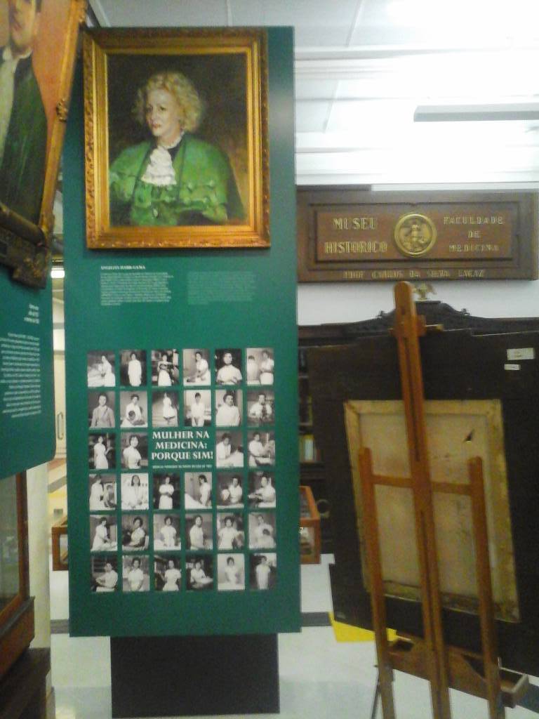 De cara, o guia da visita monitorada desfez meu nariz torto para os retratos dando algumas palavras sobre a biografia de alguns dos Diretores. Não sei porque, sempre fico interessado na trajetória de sujeitos que estão por aí deixando seu tijolinho no mundo. O guia me destaca que nenhuma mulher foi diretora ao longo dos cem anos da instituição, e para sanar essa ausência feminina montaram um painel dedicado à primeira mulher cirurgiã do Brasil e primeira professora titular da Faculdade, Angelita Habr-Gama, com fotos também de alunas de sua
