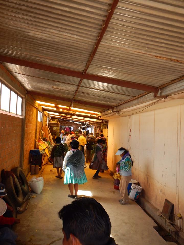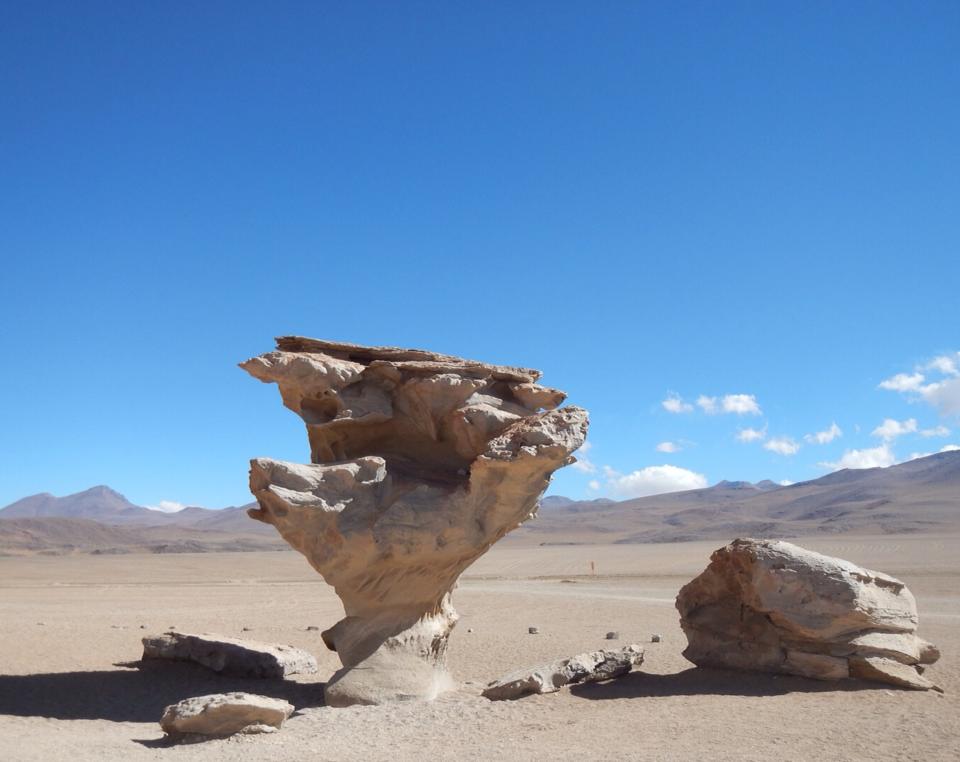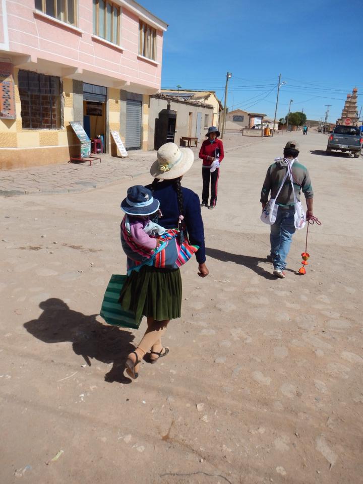Seguimos no jipe para o Deserto de Dalí, que tem este nome devido às formações rochosas e sua coloração. Obras de arte da natureza! Foi assim que após passar por inúmeras montanhas, vulcões (ativos e inativos), ficar pertinho da divisa com o Chile e depois da Argentina, ver gêisers, lhamas, flamingos e uma desértica estrada, chegamos ao único momento em que nos lembramos que era carnaval. Na comunidade San Cristóbal, as cholas (termo que já foi pejorativo no passado, mas hoje é oficialmente usado para denominar as mulheres de descendência indígena aymara, vestidas com suas longas saias, com uma espécie de “tecido-bolsa” nas costas e cabelo repartido ao meio em longas tranças) comemoravam alegremente o carnaval. Para esta cultura, a festa é muito sagrada e os ramos verdes que vocês podem ver na imagem significam esperança e boa sorte para as colheitas e para o resto do ano do povo de San Cristóbal.