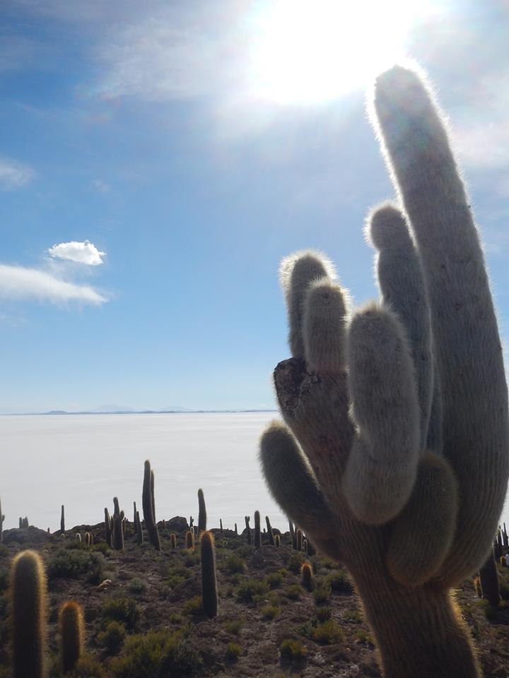 Nosso primeiro destino foi o Salar de Uyuni, um planalto com aproximadamente onze mil km² de área que foi, há quarenta mil anos, parte de um grande lago que secou. Ele também é chamado de “espelho do céu”, porque é formado por um lençol de água saturada de sal com uma profundidade entre dois e vinte metros em que apenas a superfície contém uma crosta sólida que se estende até onde a vista pode alcançar. Demos sorte pela visita na época das chuvas, quando a água dissolve a crosta superficial e transforma a paisagem, de fato, num imenso e límpido espelho.