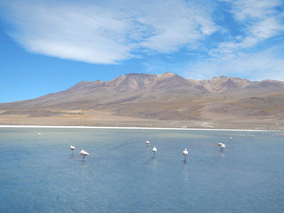 No segundo dia, partimos cedinho para as lagunas coloradas, grandes lagoas no meio da aridez do deserto que têm colorações diferentes devido à presença de algas e de minerais: branca, verde e a famosa lagoa vermelha. Nelas, inúmeros flamingos coloridos (alguns deles em extinção) apresentam calmamente seu balé nas águas muito geladas destes verdadeiros oásis. Paramos para almoçar ali mesmo, sentados atrás do jipe para nos proteger do vento frio. Ali, o Orlando (que não só era o guia, mas o motorista, cozinheiro e faz-tudo) preparou uma macarronada com carne de lhama e vegetais para saciar os esfomeados turistas. Fiquei com o macarrão e os vegetais, mas os que provaram a carne exótica que, segundo o Orlando, é “a mais nutritiva do mundo”, sem se importarem tanto com a veracidade da informação, disseram ser mais saborosa que a bovina. De toda forma, estes simpáticos animais pareciam ser os únicos habitantes da face da terra durante a maior parte da nossa jornada. Parecendo mais um cruzamento de ovelha com girafa, têm fofos brinquinhos colocados por seus donos para que identifiquem a qual proprietário pertencem e — além da carne — sua lã é amplamente utilizada para a tecelagem no país.