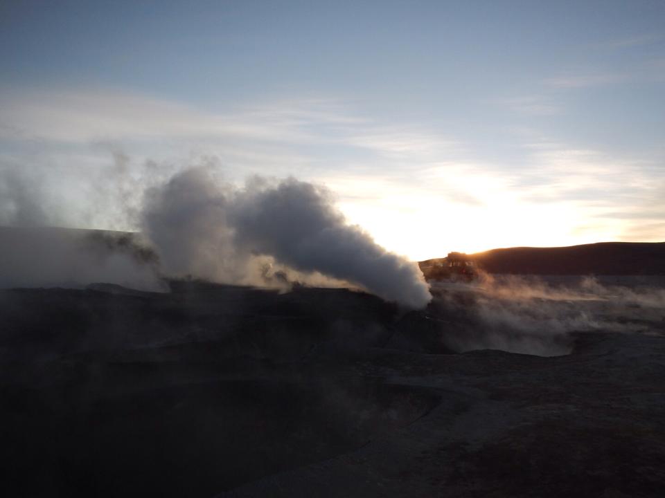 Dormimos em outro refúgio (desta vez feito de barro) e acordamos numa friaca de seis graus Celsius NEGATIVOS, em pleno verão. Como nosso “faz-tudo” Orlando nos contou, o tempo estava apenas “fresquinho”! No inverno, seriam pelo menos vinte graus abaixo de zero. Começamos o dia visitando os gêisers (com vapores que saem de fendas no chão, parecendo uma chaleira gigante, e alcançam uma altura de até seis metros) e o nascer do sol, numa altitude de cinco mil metros. Depois, alcançamos um recanto com águas termais naturais. Foi incrível a sensação contrastante de “nadar com lhamas” numa água quentinha, com a cabeça fora d’água respirando os seis graus abaixo de zero!