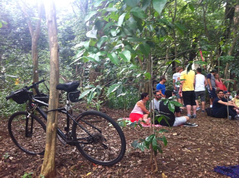 No sábado, chegamos no festival no fim de tarde, onde uma atmosfera de paz, absolutamente deliciosa, estava presente no ar. Como visitantes de primeira viagem, a impressão que tínhamos de fora era de que aquela área carecia de verde. Entrando lá, percebemos que estávamos enganados. No Parque Augusta, a sensação de estar imerso na natureza é muito maior do que em qualquer parque maior da cidade, como os imensos Ibirapuera e Villa Lobos. A mata fechada e aquelas copas de árvores — virgens e imensas — faz a gente esquecer que estamos a poucos metros do concretismo da grande rua da Consolação.