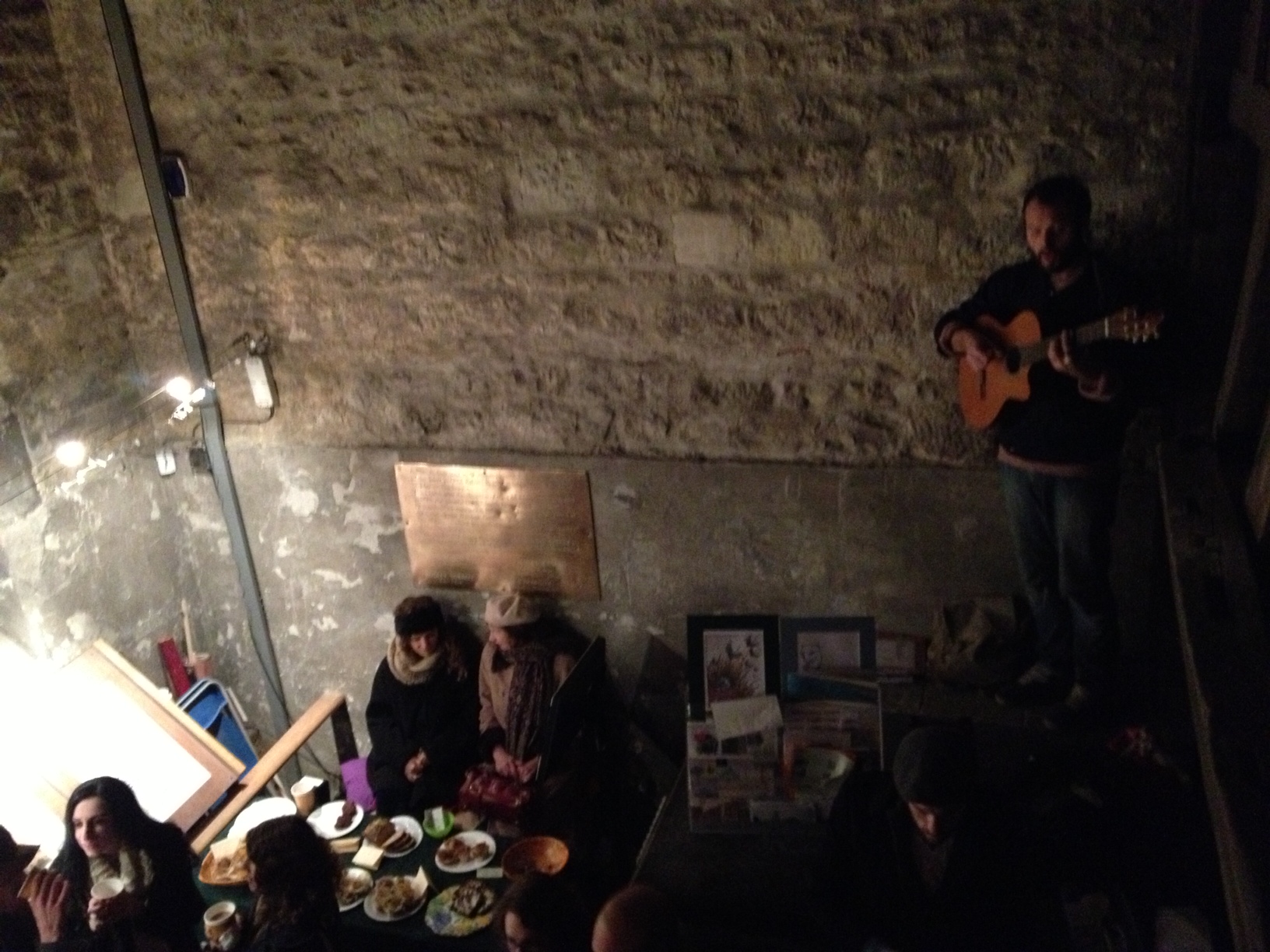 A segunda surpresa veio logo na entrada. O evento começava no pequeno e aconchegante térreo da torre. Um músico fazia uma serenata, cantando e tocando violão do alto de um platô, enquanto os convidados se acomodavam. Algumas pessoas se serviam de mulled wine — uma bebida deliciosa, tipicamente natalina que consiste em vinho quente, especiarias e frutas — e de bolos caseiros.