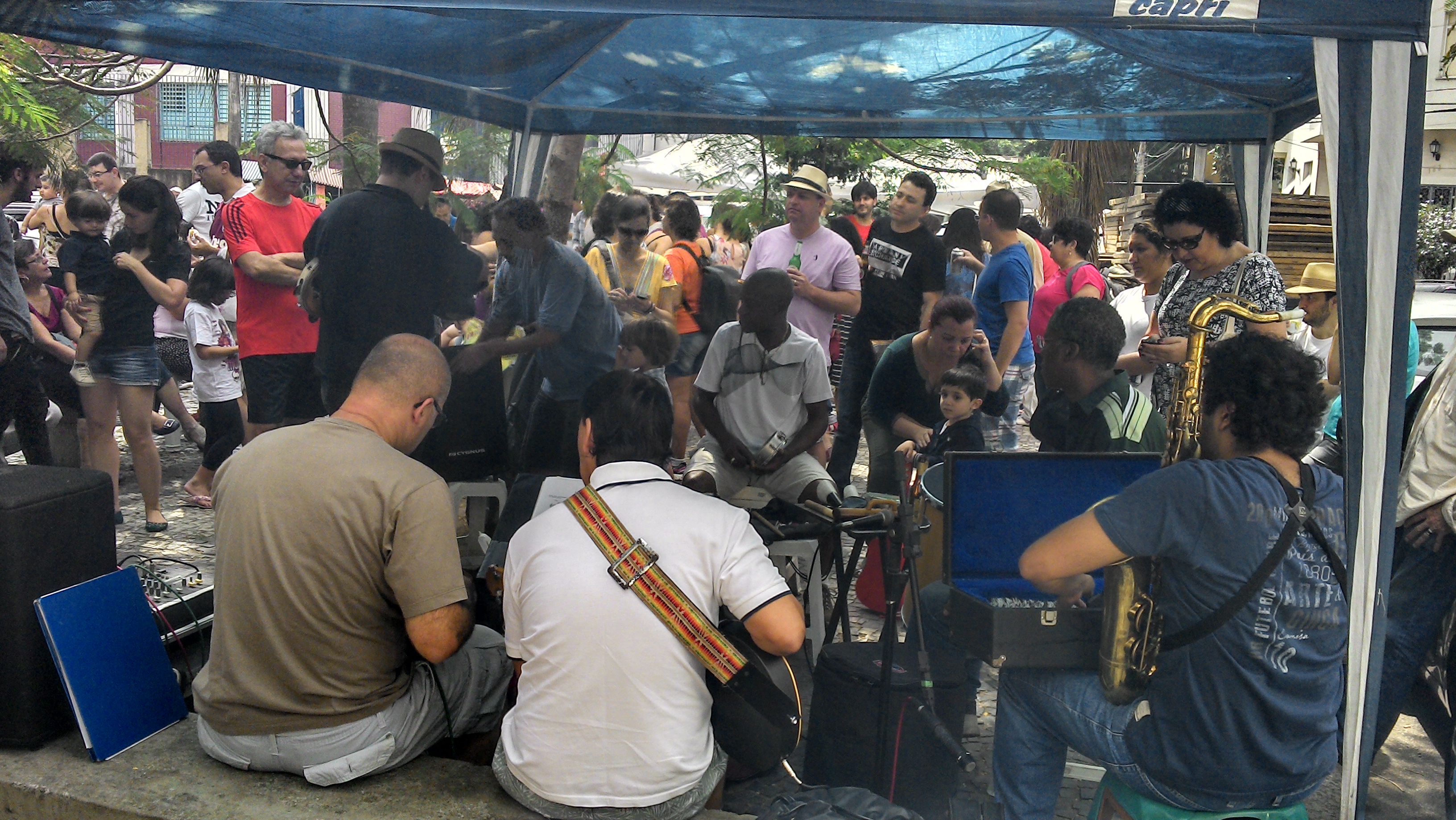 O ambiente é família pra caramba. Muitos casais com bebês, crianças brincando soltas e idosos, mas a boêmia mora ao lado e, nesse caso, vem acompanhada de um som da maior qualidade, o chorinho do grupo Pixin Bodega. Os músicos começam a se preparar por volta de meio dia, sempre levam convidados e tocam sucessos na praça, de graça, é só chegar. Nessa hora, entra em cena a cervejinha gelada ou um bom drink (a barraca do Luizinho se encarrega das misturas).