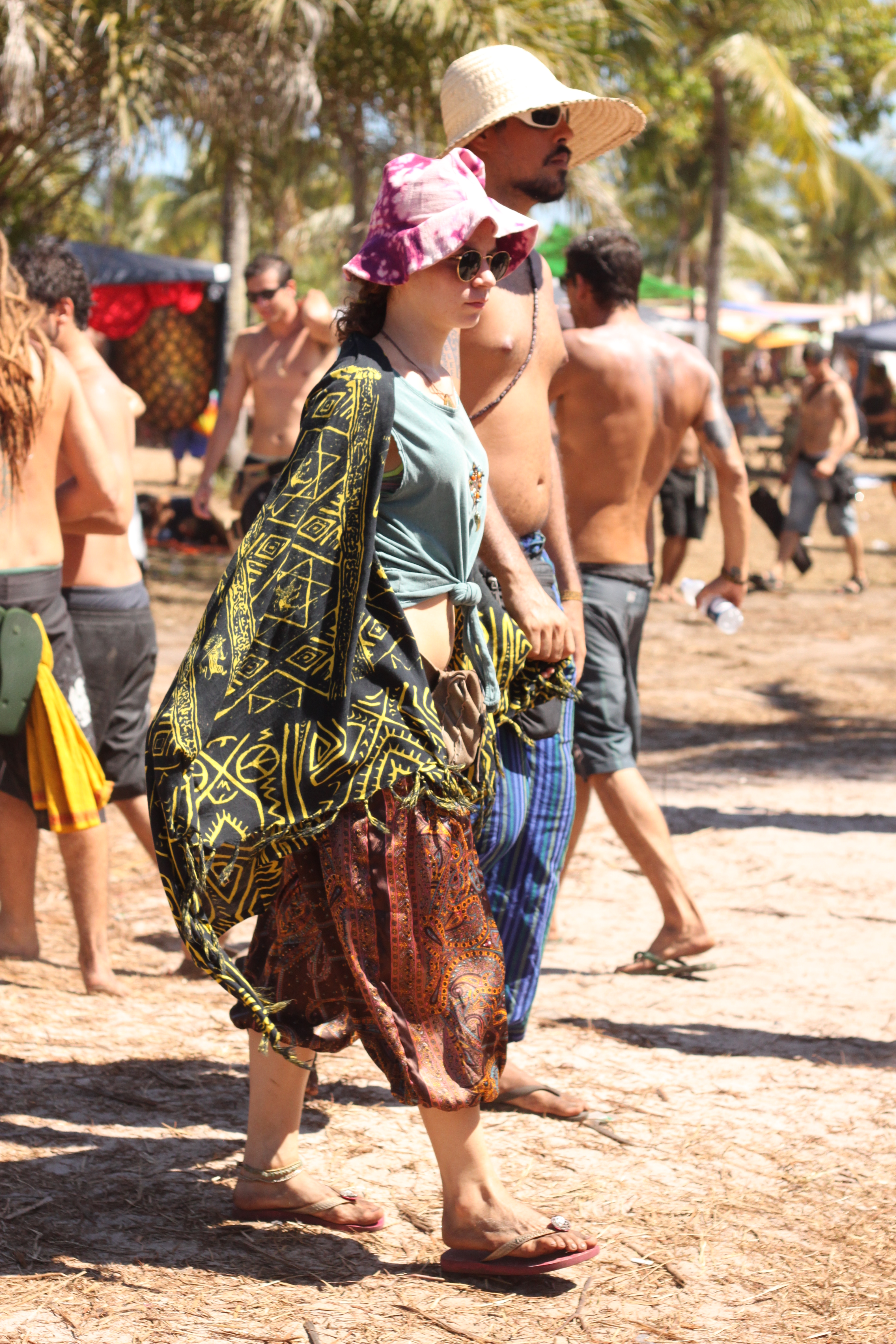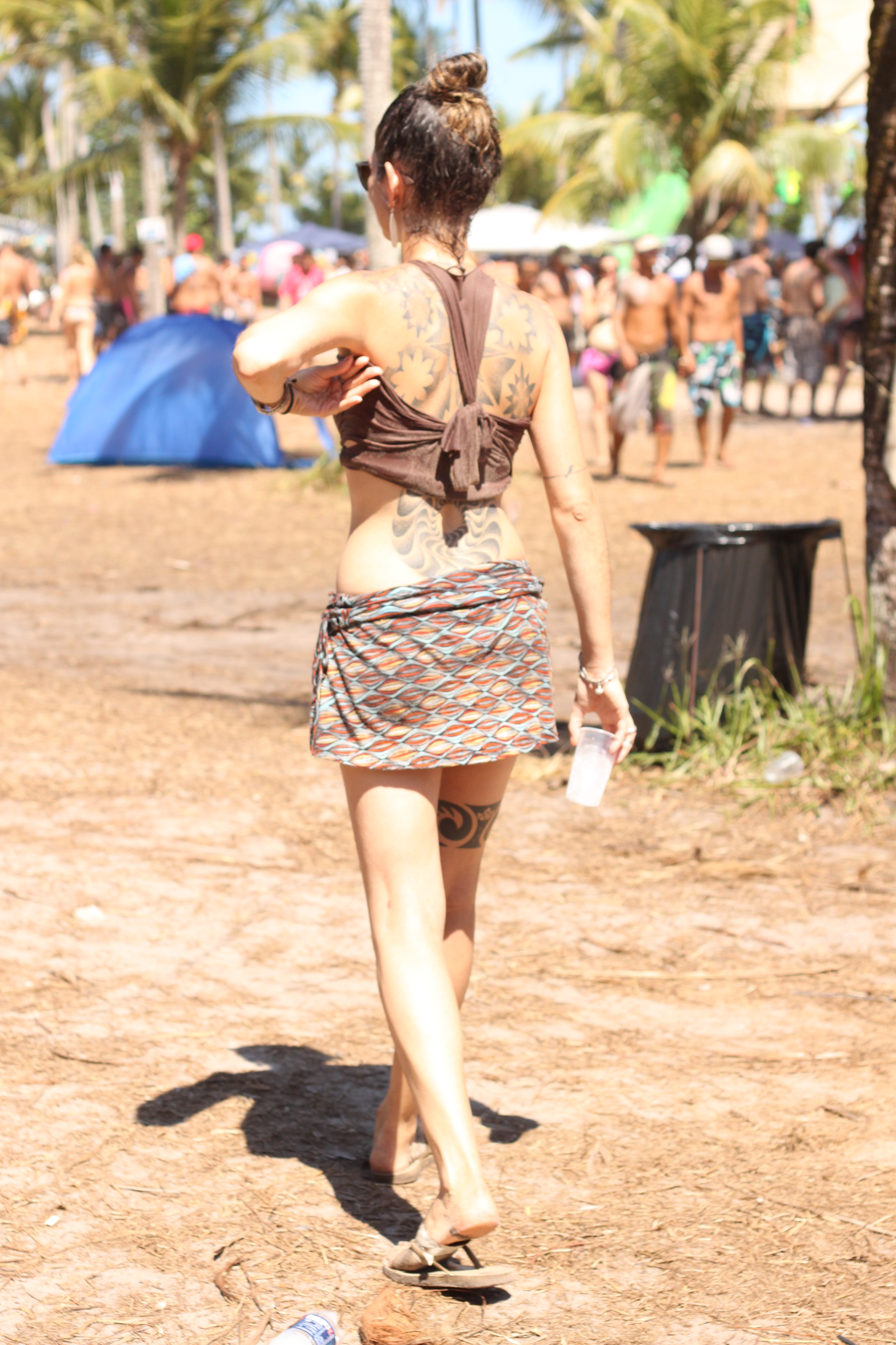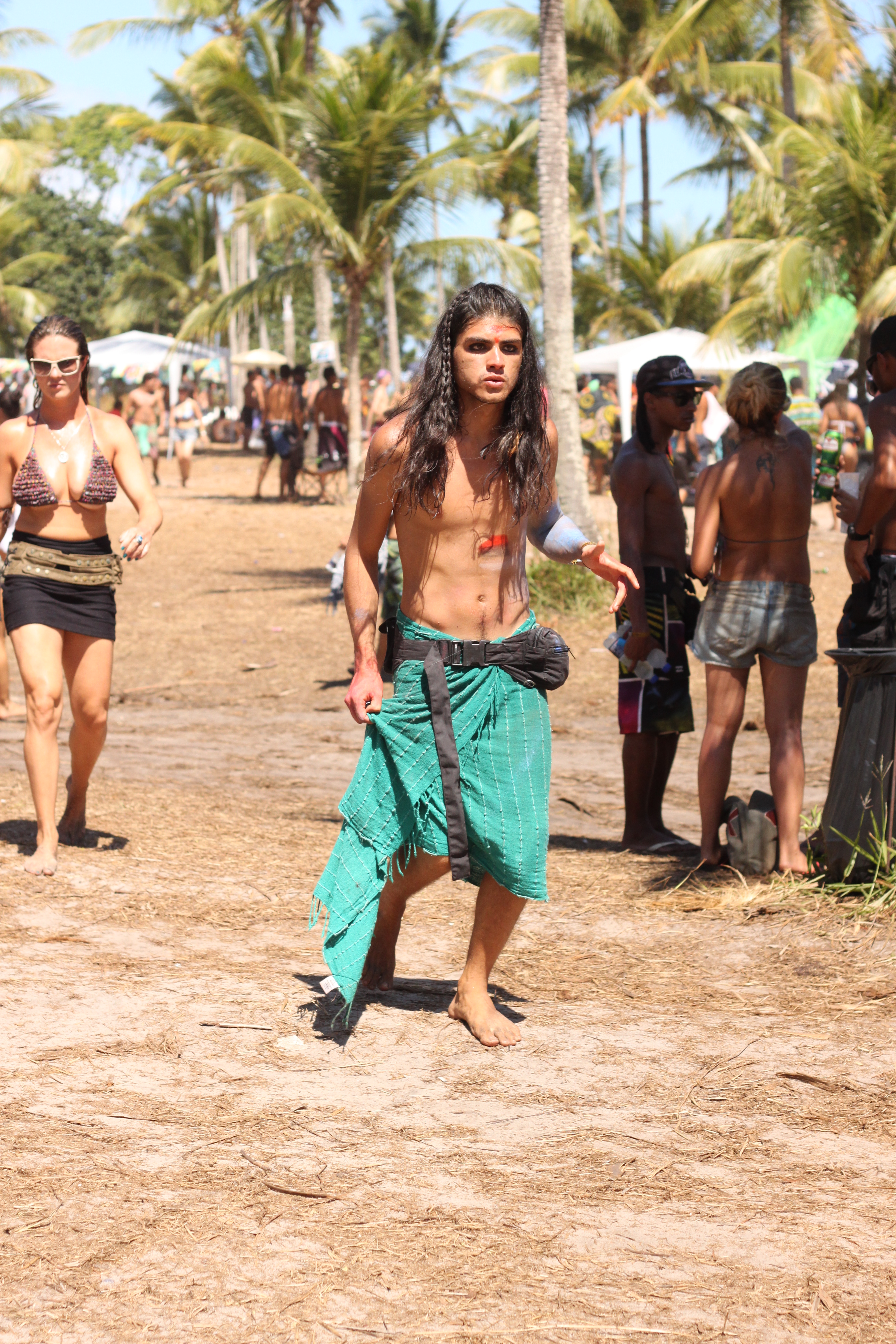 Nos cinco dias em que estive no Universo Paralello Festival, me senti particularmente desperta para o jeito de se vestir e de se enfeitar das pessoas. Havia um estilo próprio – e ao mesmo tempo muito, muito pessoal – naquele lugar. E afinal, a criatividade era palavra de ordem, já que no calor senegalês do litoral baiano era impossível usar muita roupa, ou se arrumar demais. Maquiagem estava fora de cogitação, mas pinturas faciais davam as caras, misturadas às vezes ao zim (aquele pó colorido) espalhado pelo mainfloor.