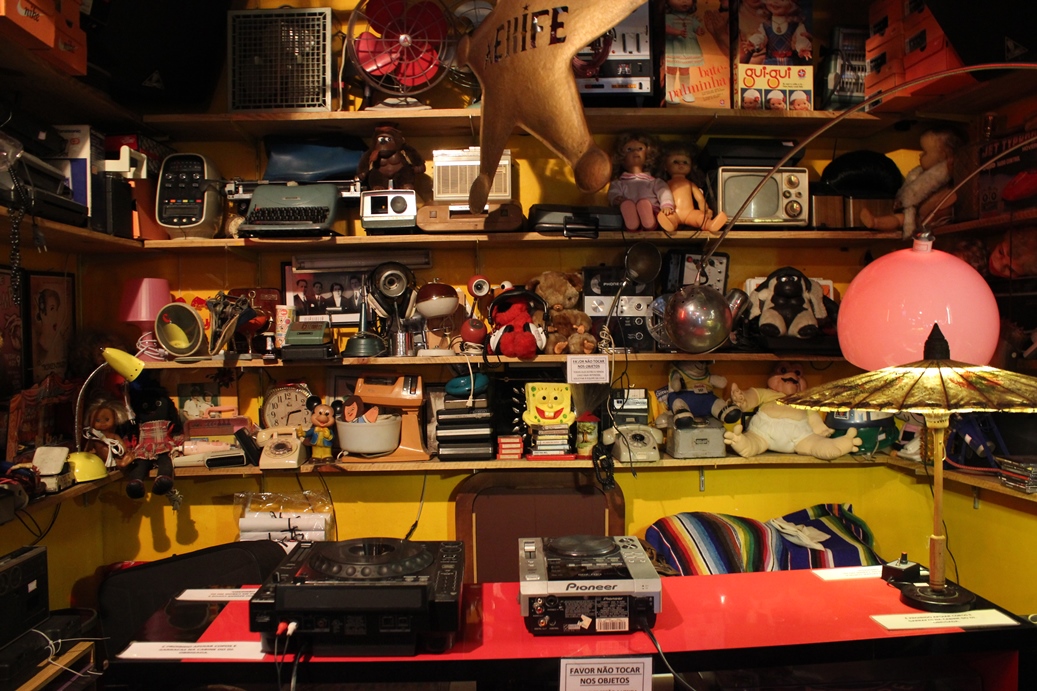 Sentei em uma poltrona em frente a que eles estavam e perguntei como surgiu a ideia da loja. O Tibira, com uma imponência simpática, me respondeu: “Eu tinha um galpão na Vila Madalena de uns 600 m². Liquidei metade das coisas que eu tinha nesse galpão, peguei o resto e guardei num outro lugar. Fiquei com essas coisas guardadas e continuando a minha coleção, aí eu liguei pra Carrô e falei, “Carrô, tô com umas 2 mil, 3 mil peças de coisas guardadas, vamos abrir uma loja com um bar?” E ela tinha o acervo dela, aí as coisas foram acontecendo e a gente achou esse ponto. Chamei ela pra ajudar e a gente chamou um menino pra fazer o cenário e aconteceu. Estava no fim do Vegas já. E essa coisa de balada que começa meia-noite e vai até cinco da manhã, a gente trabalhava tipo de terça à domingo, né, cara! After hour que era uma coisa bem louca. Então nesse intermédio eu estava com um monte de coisas guardadas, meio com dó de deixar tudo isso guardado e aí a ideia veio meio que disso. Porque, na verdade, quando a gente coleciona, a gente tem um pouco de receio de ficar expondo, porque já quebrou um monte de coisa, já sumiram algumas coisas, então você tem um certo ciúme. Mas eu abri mão, desapego total, vamos fazer.” Foi aí que a Carrô, com seu olhar emoldurado por uma franja rubra complementou: “É, eu tinha ciúme e agora não tenho mais, sinceramente eu não tenho ciúmes de quase nada. Até minha bicicleta, essa semana, eu trouxe pra vender.” Seguindo de uma risada gostosa, um clima acolhedor que esteve presente durante todo o papo. Eles me explicaram que enquanto o Tibira coleciona seu acervo desde os 14 anos de idade, a Carrô trabalhou em cinema como produtora durante 12 anos.
