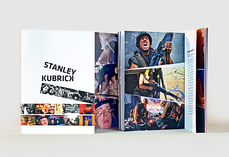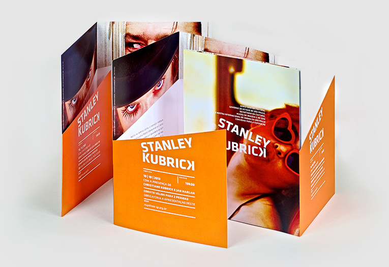 Ela também me explicou a correria que foi para entregar todas as suas “brincadeiras” gráficas em um prazo relativamente curto, como as oriundas de imagens dos filmes do diretor, que foi feita com o nome de Kubrick em forma de uma claquete baseada no olhar dos atores e do diretor, um uso muito sensível das imagens para a elaboração do convite da exposição.