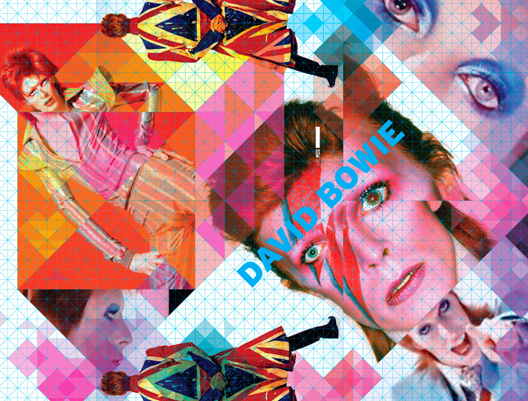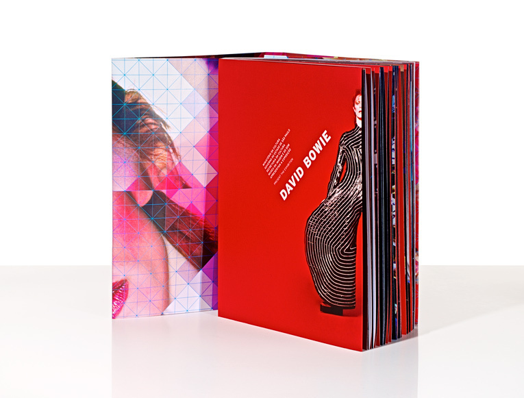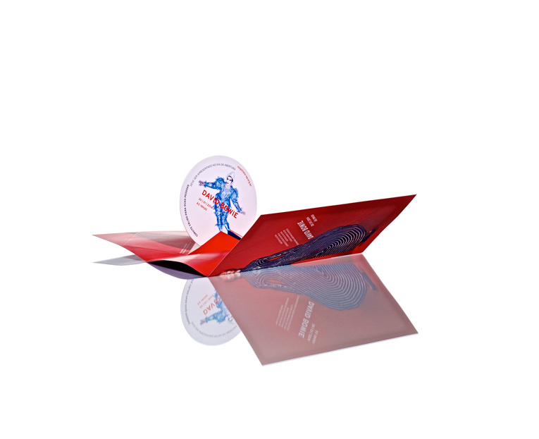 Por fim, como não poderia faltar, tivemos um papo sobre a identidade visual da exposição sobre o David Bowie — ou, na minha opinião, o Ney Matogrosso inglês—, que está rolando no MIS. Quem não viu ainda, tem que ver! Sobre o Bowie, a minha entrevistada teve a grande sacada de entender, como ela mesma diz, que “o artista é um camaleão. Na moda, na música, como ator, em suas roupas”. Partindo dessa premissa, ela buscou “tridimensionalidade” na parte visual da exposição, dando “amplitude como se fosse um universo”. Ao abrir o folder da exposição pela primeira vez, tomei um susto quando vi imagens triangulares saltando do papel, como um origami. Já quando abri o convite, vi saltar um pop-up circular com a imagem do cantor britânico. Neste trabalho, assim como em todos feitos por Nasha, nota-se que tudo foi feito com muita paixão.