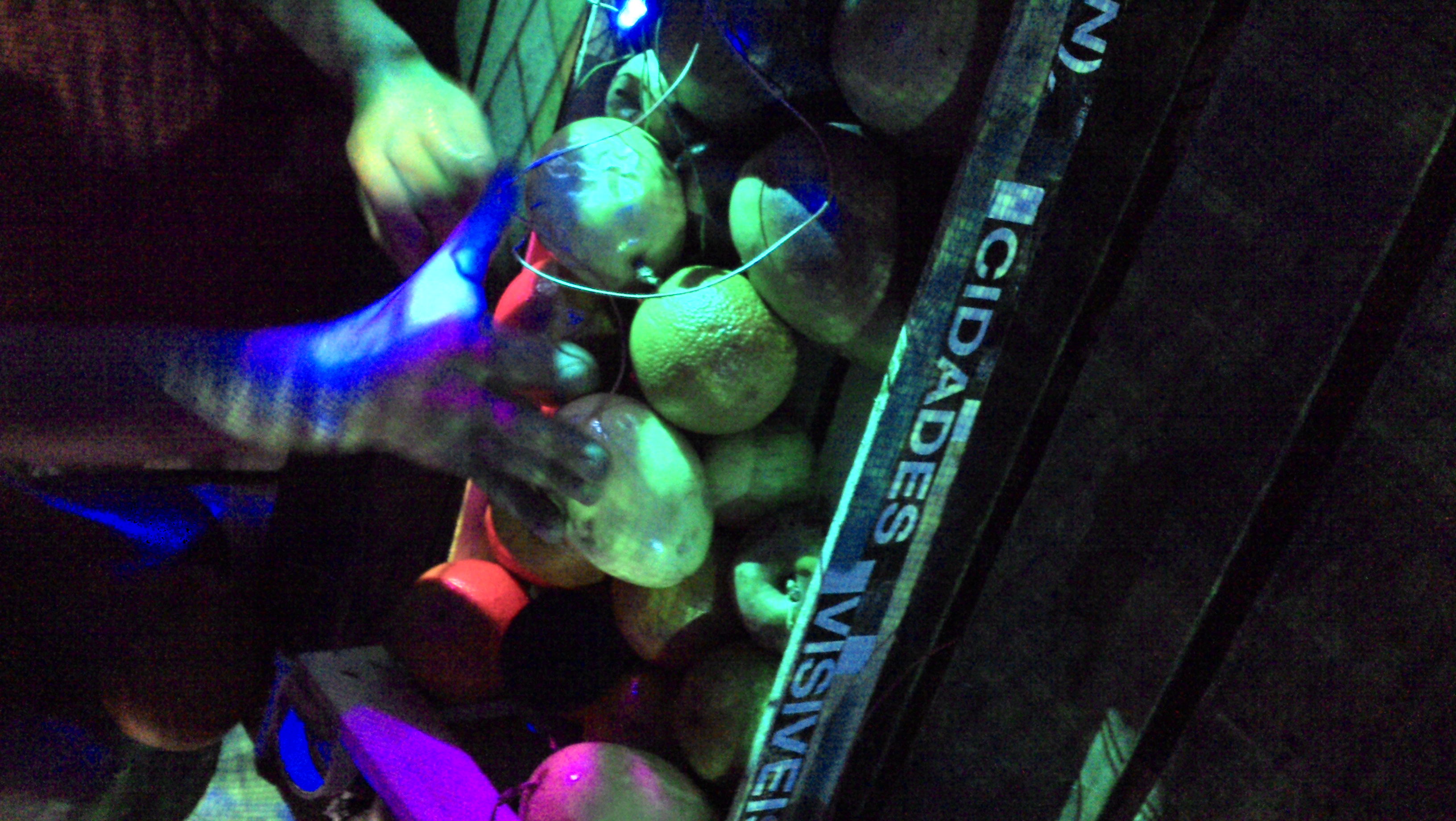 Como a tecnologia pode potencializar a arte? Cheguei cedo ao evento, não só para tentar responder o quanto antes a essa questão, como também para aproveitar a entrada 0800 até às 22h. Dei de cara com a instalação “Simbinoise”, dos Biônicos, que propõe, como explicam os próprios, “uma ponte entre corpos orgânicos através de circuitos eletrônicos”. Oi? Explico: a experiência consistia numa barraca de feira cheia de frutas ligadas a circuitos, produzindo ruídos e sons. A estética era completa com projetores que jogavam luzes e criavam a impressão de texturas na instalação.