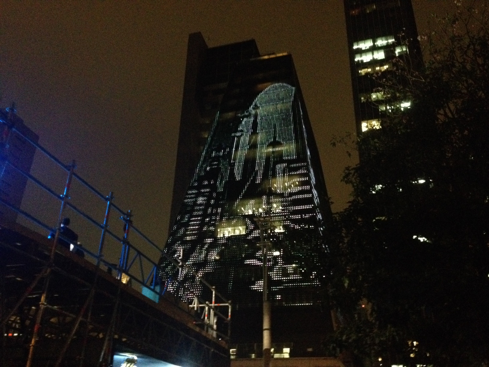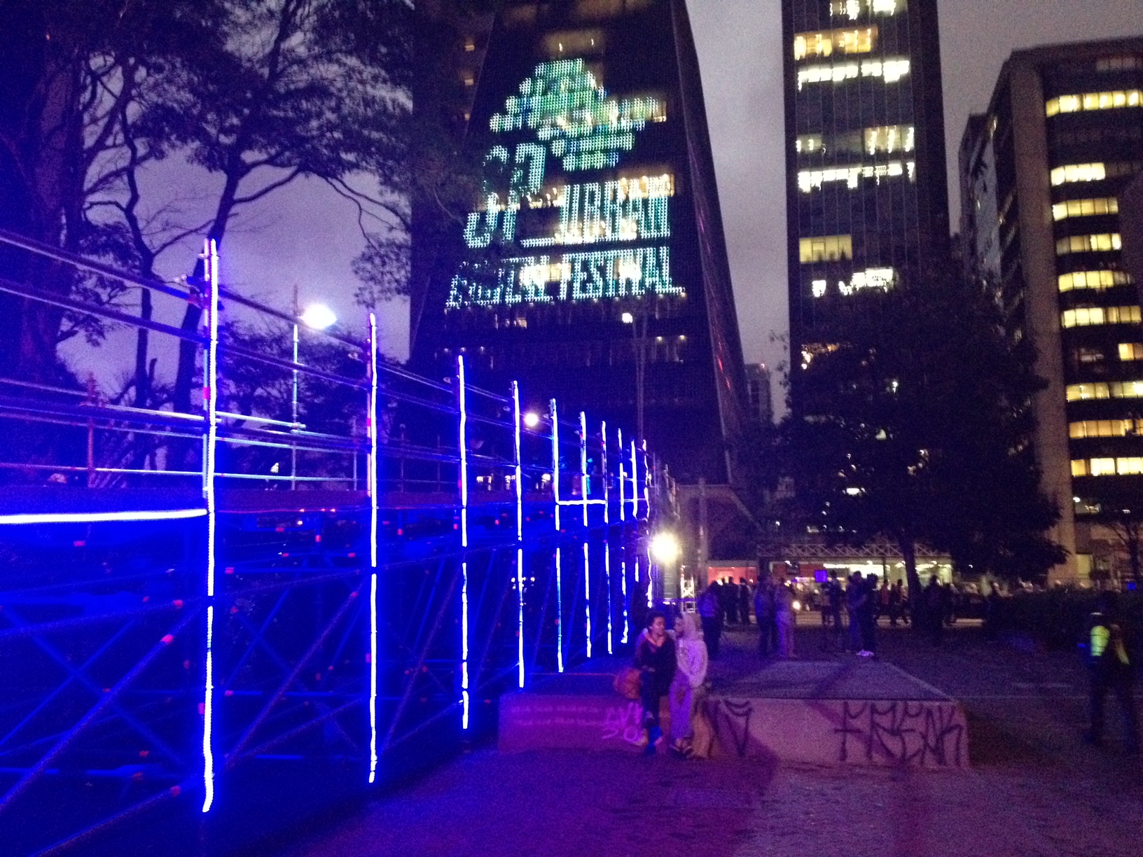 Ontem, quando passei por lá, o prédio (que é usado desde 2012 como uma grande mídia) projetava o anúncio do evento. Poucos minutos depois, às 20 horas, em uma enorme rampa de madeira do outro lado da rua, montada sobre uma estrutura adornada de LED, skatistas começaram a fazer suas manobras enquanto seus movimentos e sons eram projetados na fachada do prédio como cores e formas geométricas.